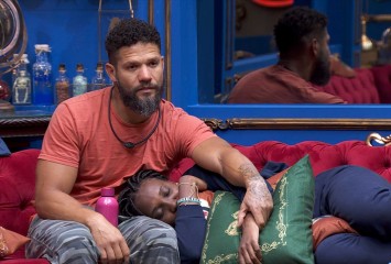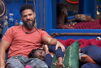Na sala, Leidy Elin e Juninho estão juntos no sofá. A sister está deitada com a cabeça no colo ...